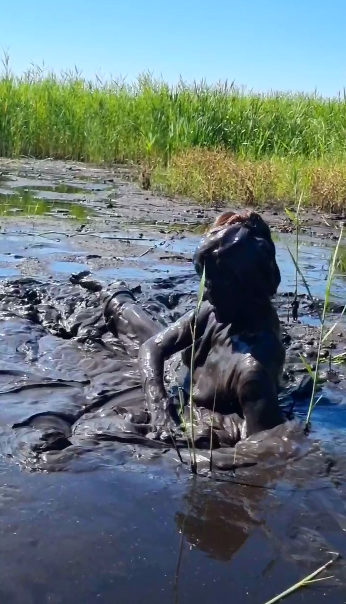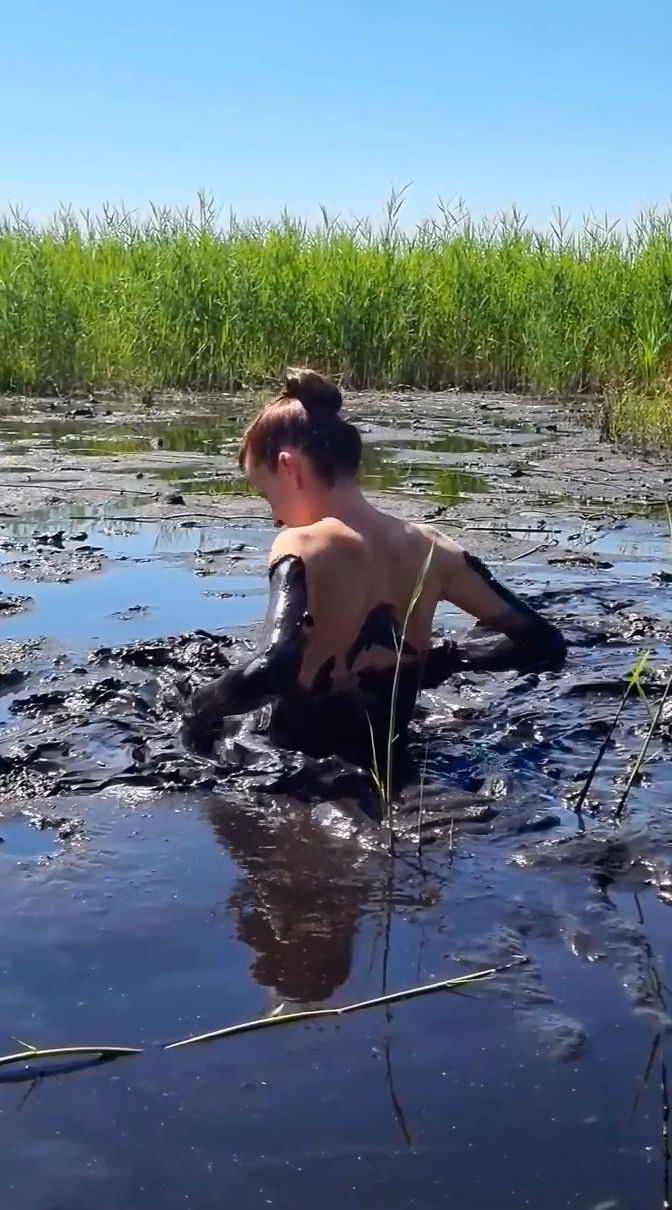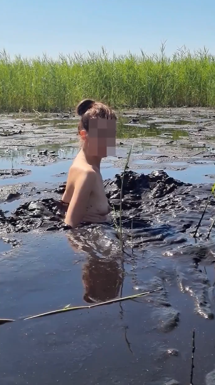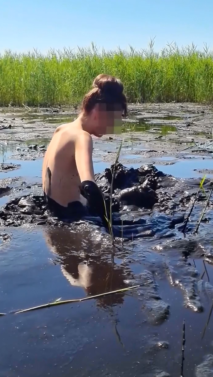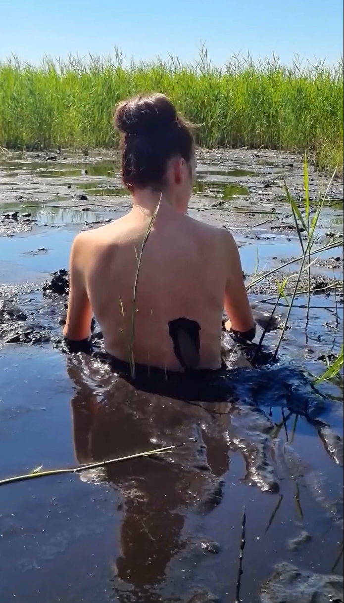 不露脸的小姐姐玩芦苇荡中的镜面黑色泥潭(竖屏)