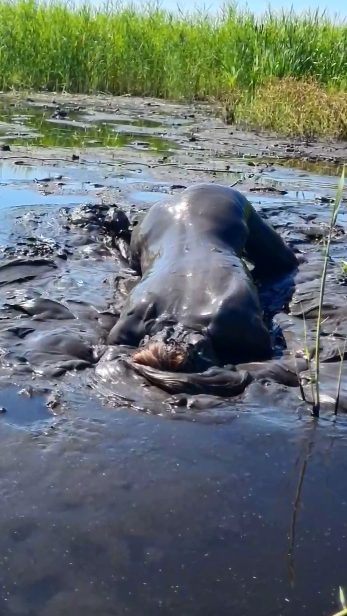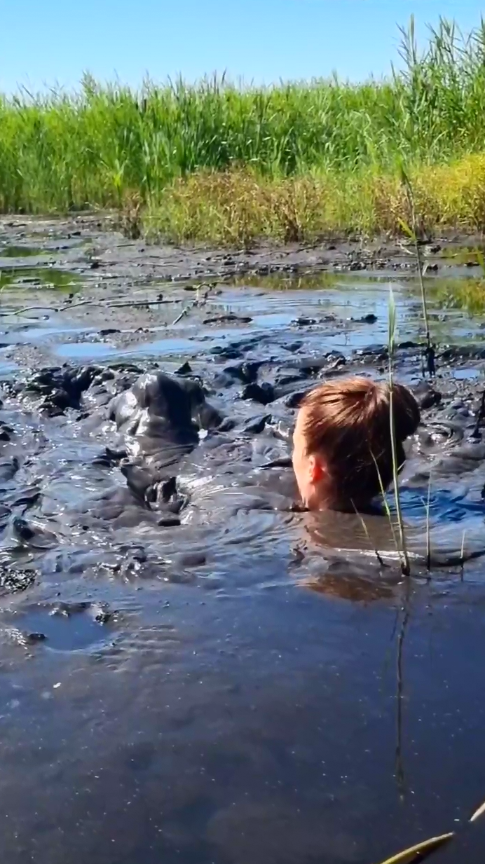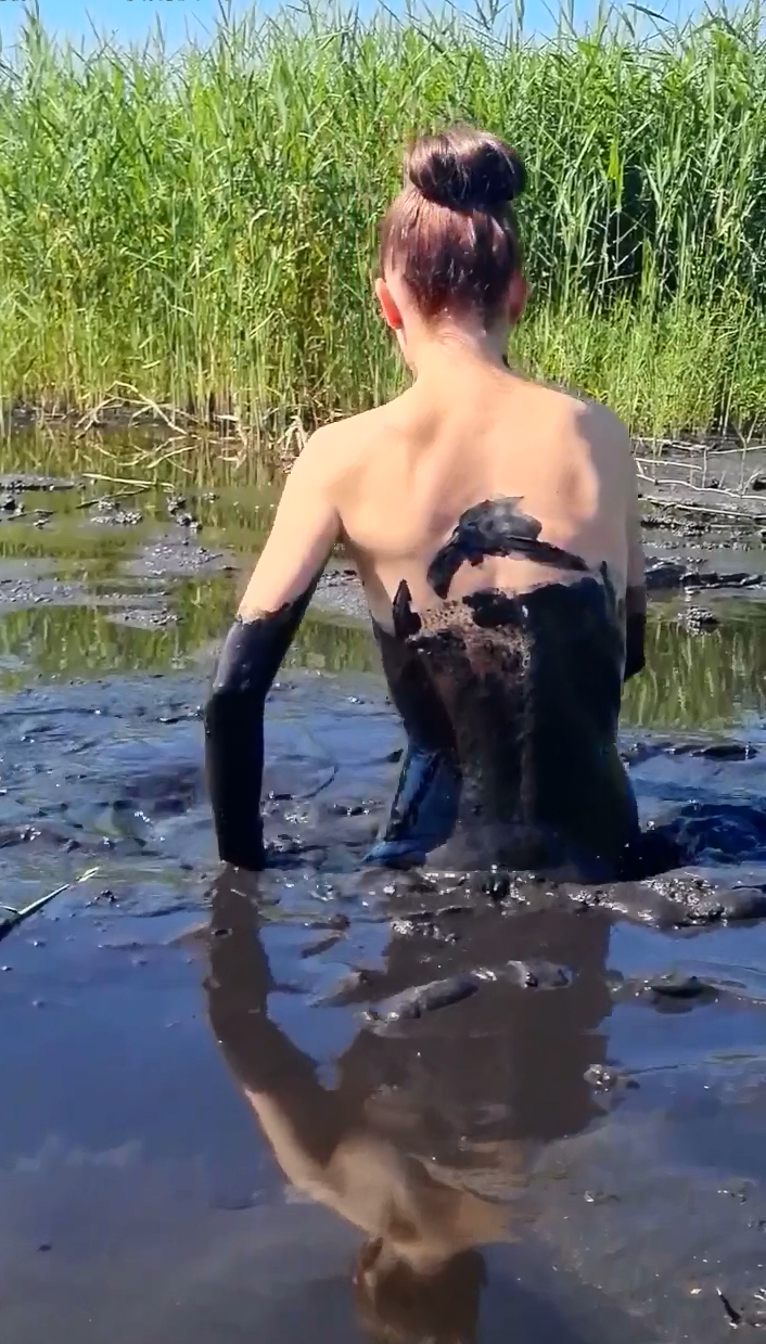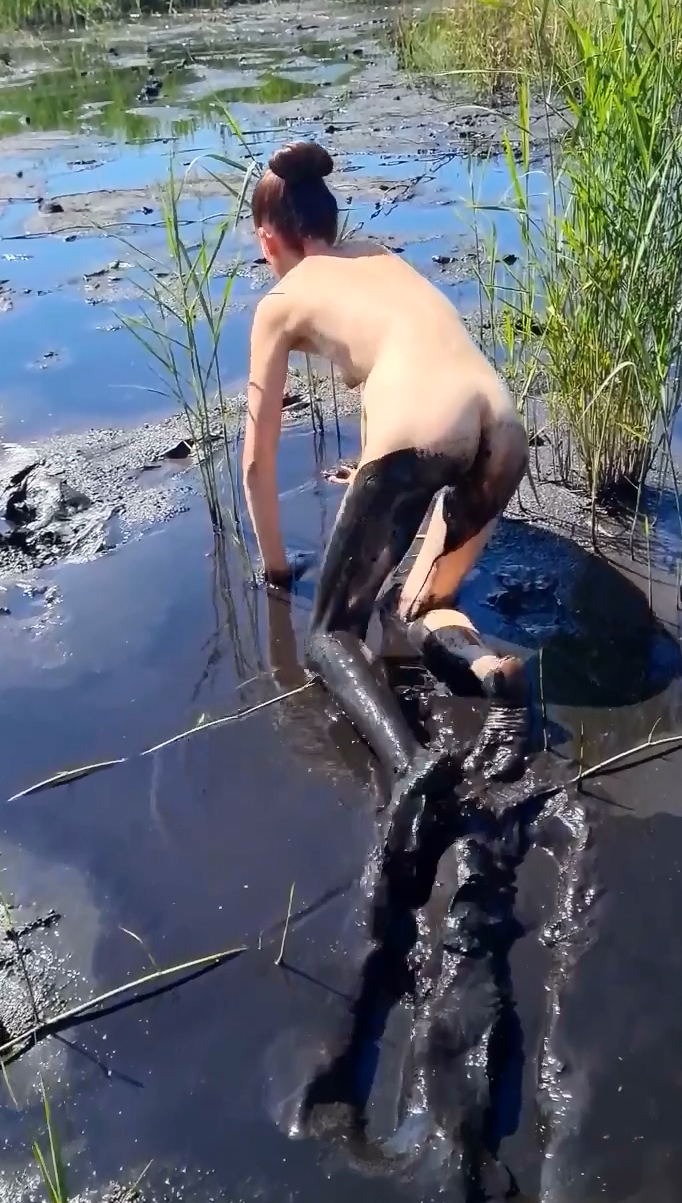 不露脸的小姐姐玩芦苇荡中的镜面黑色泥潭(竖屏)