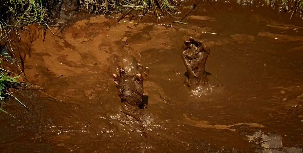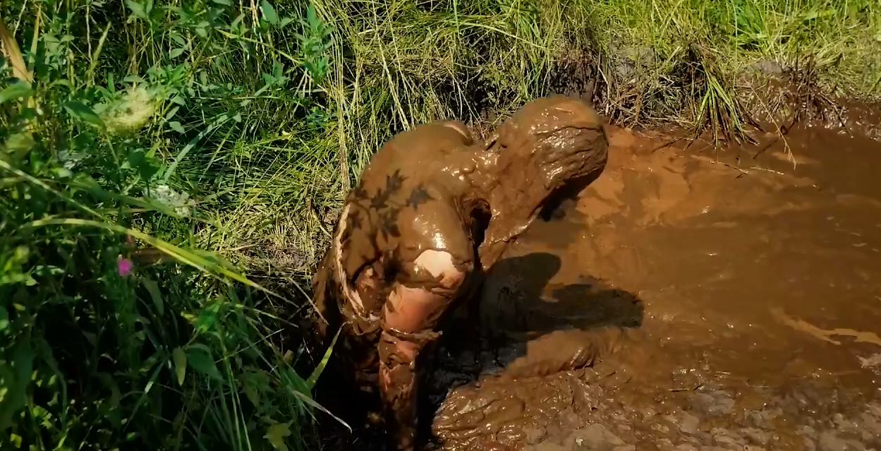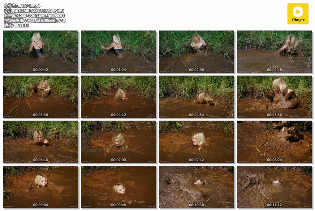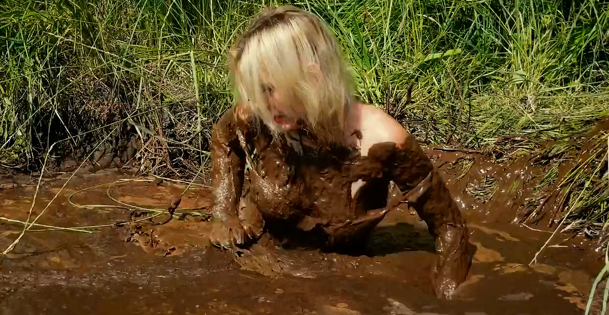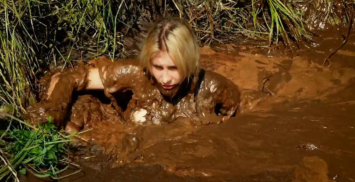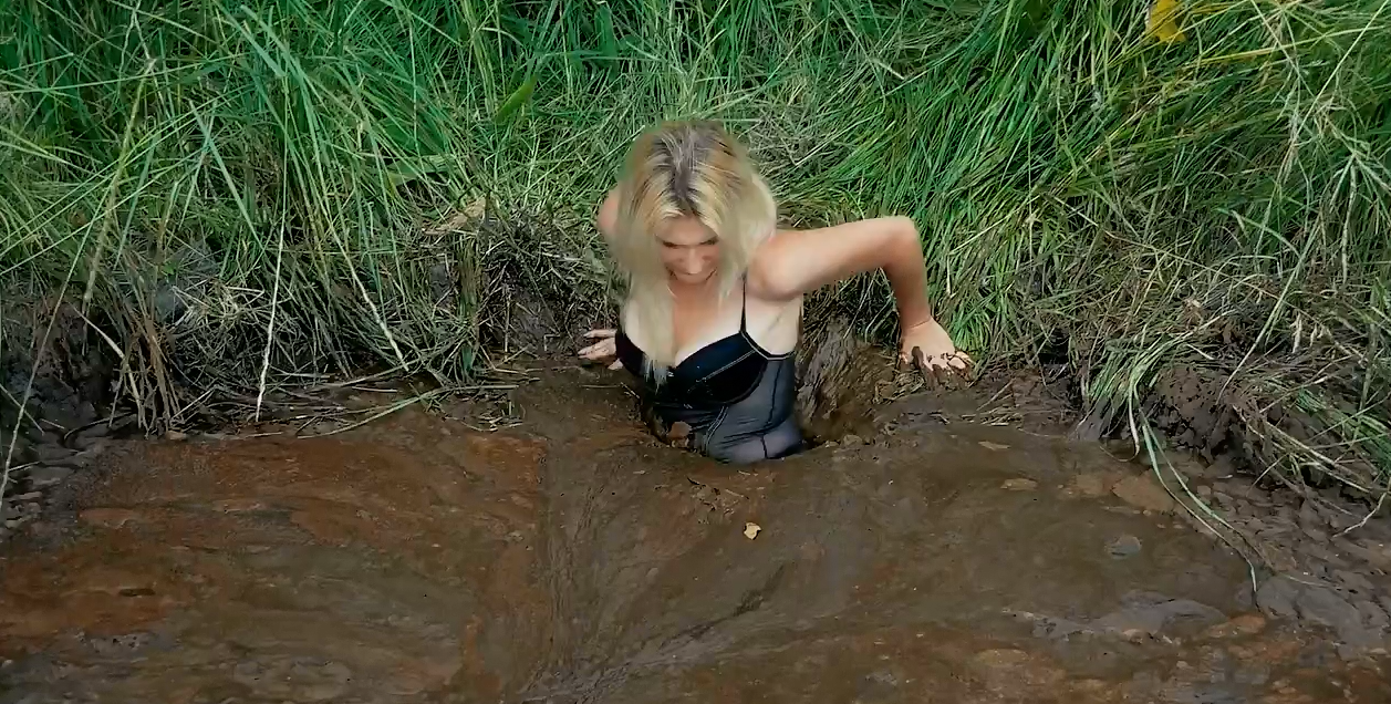 美女穿黑色吊带连衣裙下黏稠泥潭,没顶后拔出