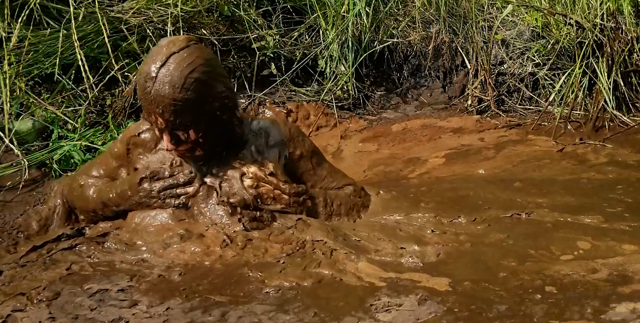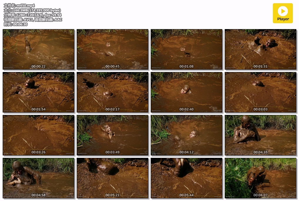 长腿军绿短裤妹子下橙色黏稠泥潭并清洗